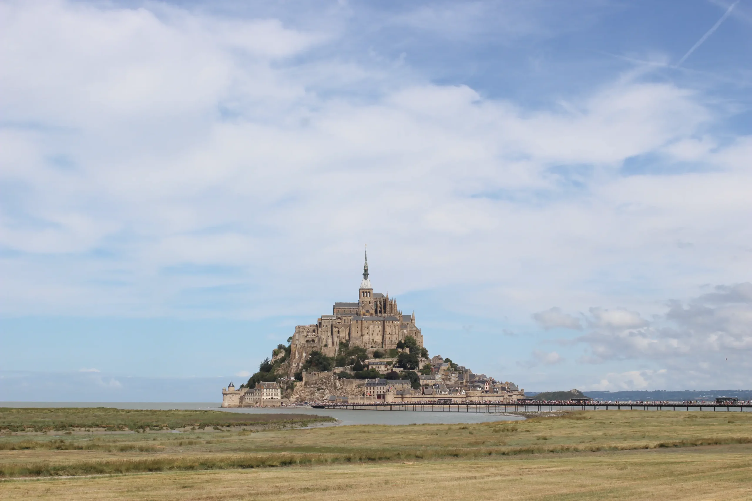 干潮時には海が引き、陸とつながる道が現れ、満潮時には島となる、フランス西部にある幻想的な修......